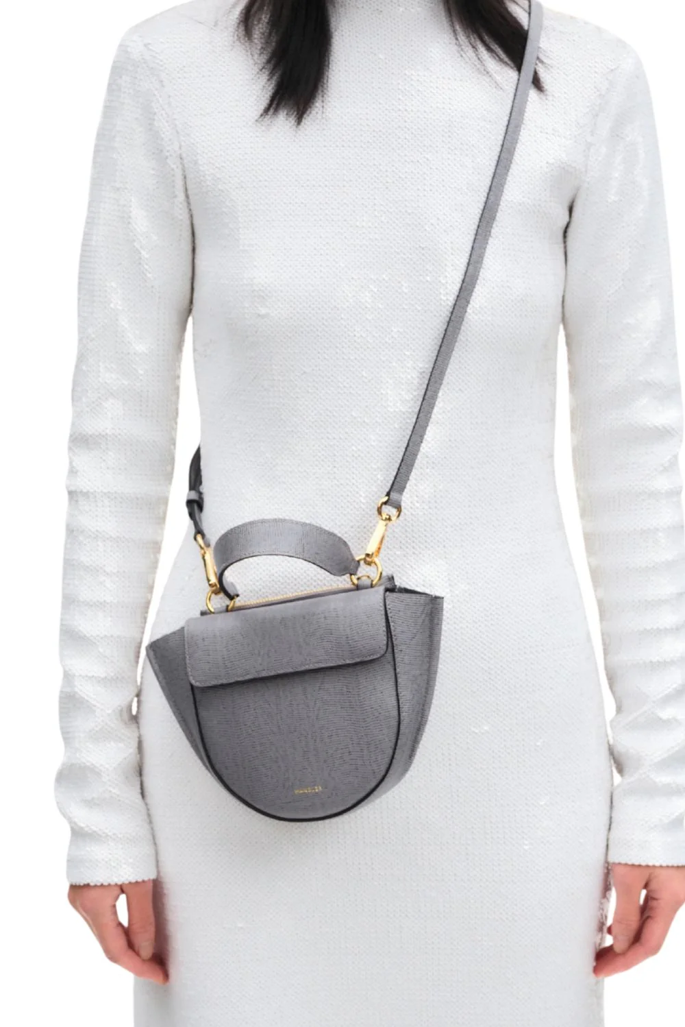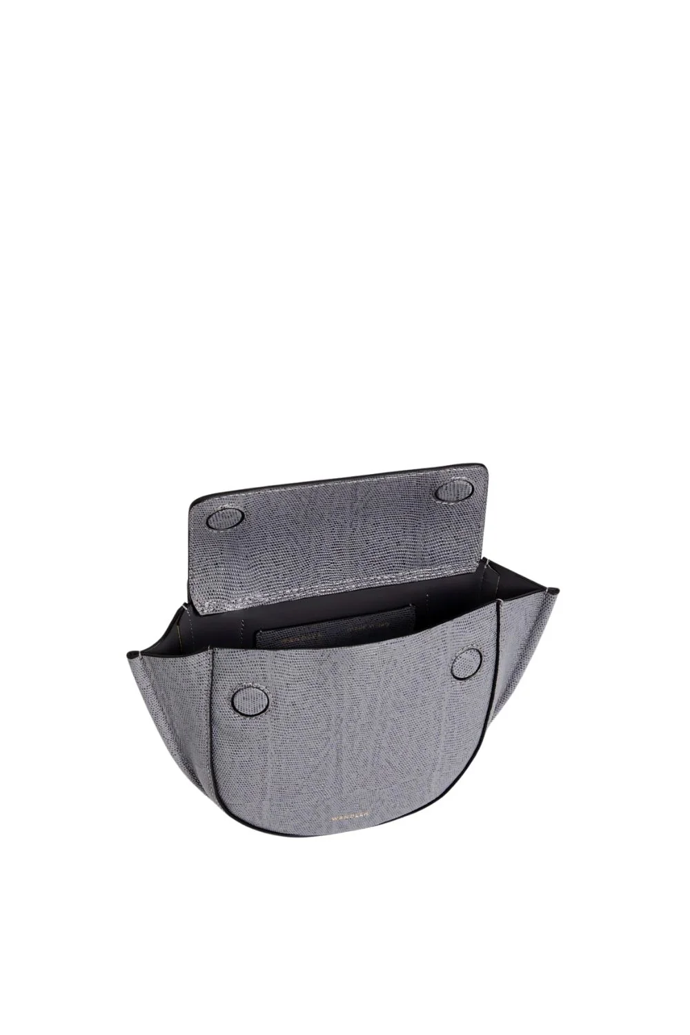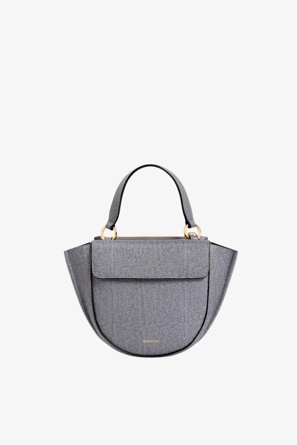 Dit is de Hortensia Piccola crossbody van Wandler, in het zachte grey lizzard leer. De halfronde vorm met de brede zijkanten geeft de tas een volle, stevige contour. De grote klep sluit de voorkant rustig af en laat de strakke lijnen mooi uitkomen. Het Italiaanse kalfsleer voelt compact en glad, met een subtiele structuur die het model extra diepte geeft. De goudkleurige ringen bij het handvat voegen een helder accent toe zonder te overheersen. Het ontwerp wordt volledig in Italië gemaakt, waar elk detail precies wordt afgewerkt. Een kleine crossbody met een duidelijke vorm en rustige verhoudingen, precies zoals je die van Wandler kent.