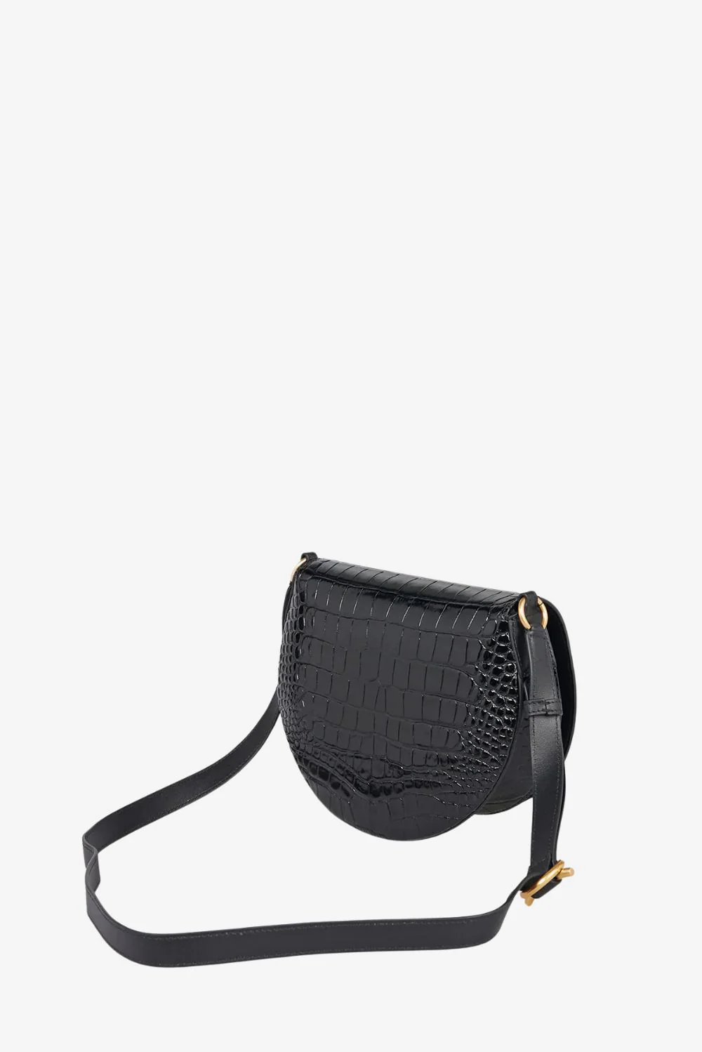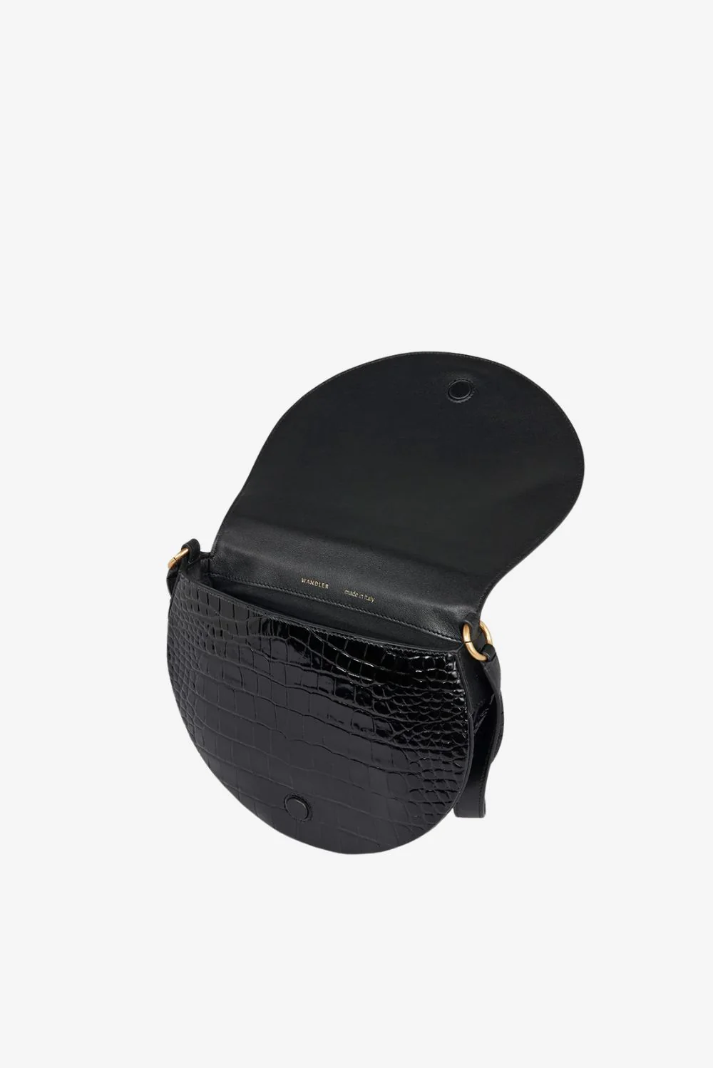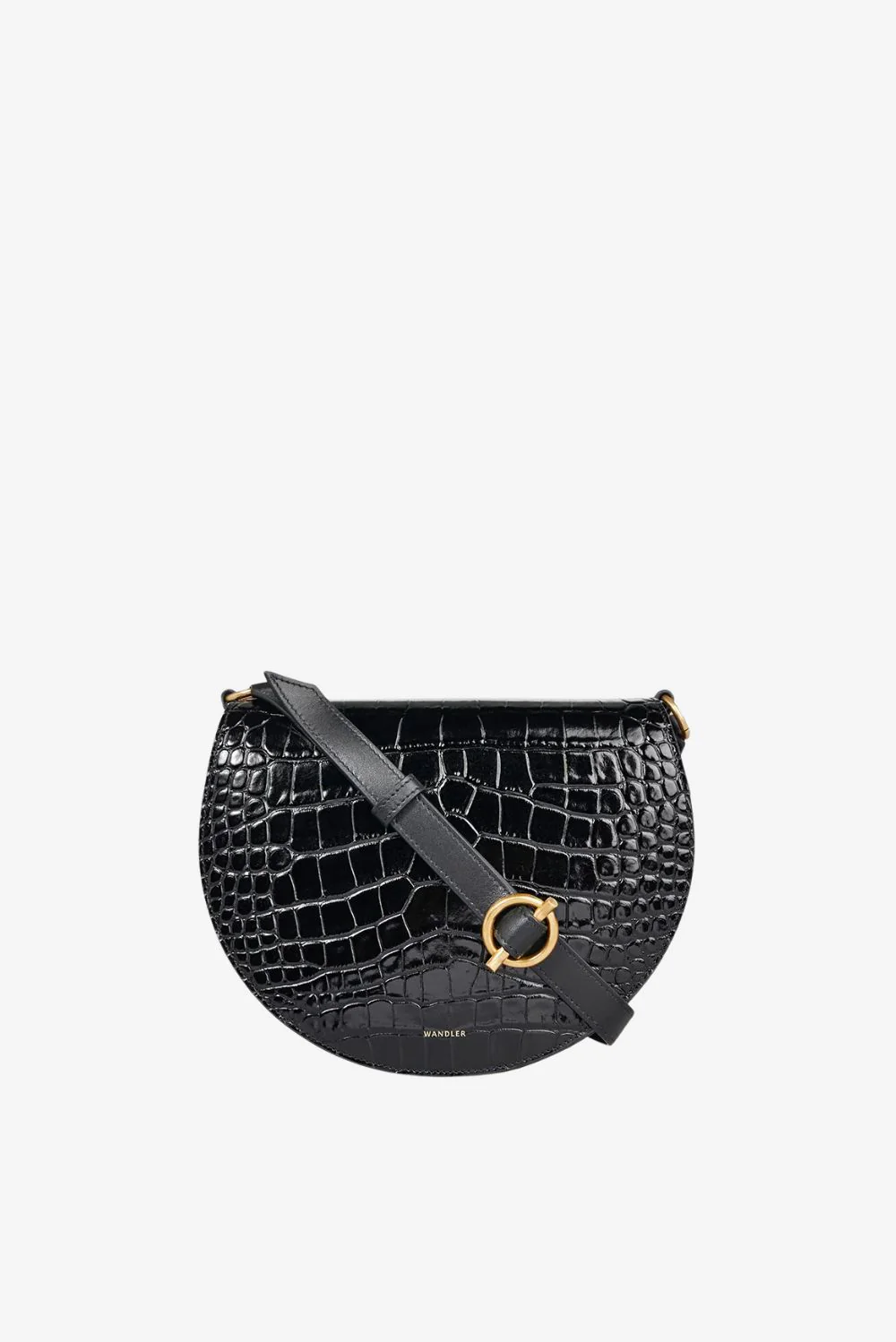 De crossbody Kate Saddle van Wandler in black croco combineert structuur en een stijlvolle uitstraling in één vloeiende lijn. Het glanzende kalfsleer met croco-reliëf voelt stevig en soepel tegelijk. De halfronde vorm ligt mooi tegen het lichaam, terwijl de symmetrische afwerking rust en balans geeft. De gouden gesp op de band voegt een subtiel accent toe dat het ontwerp accentueert zonder te overdrijven. De magneetsluiting sluit veilig en praktisch. Handgemaakt in Italië, met de aandacht voor detail waar Wandler om bekendstaat. Draag haar bij een jas in warme tinten of kies de bordeaux croco-variant voor een iets zachtere toon in je look.