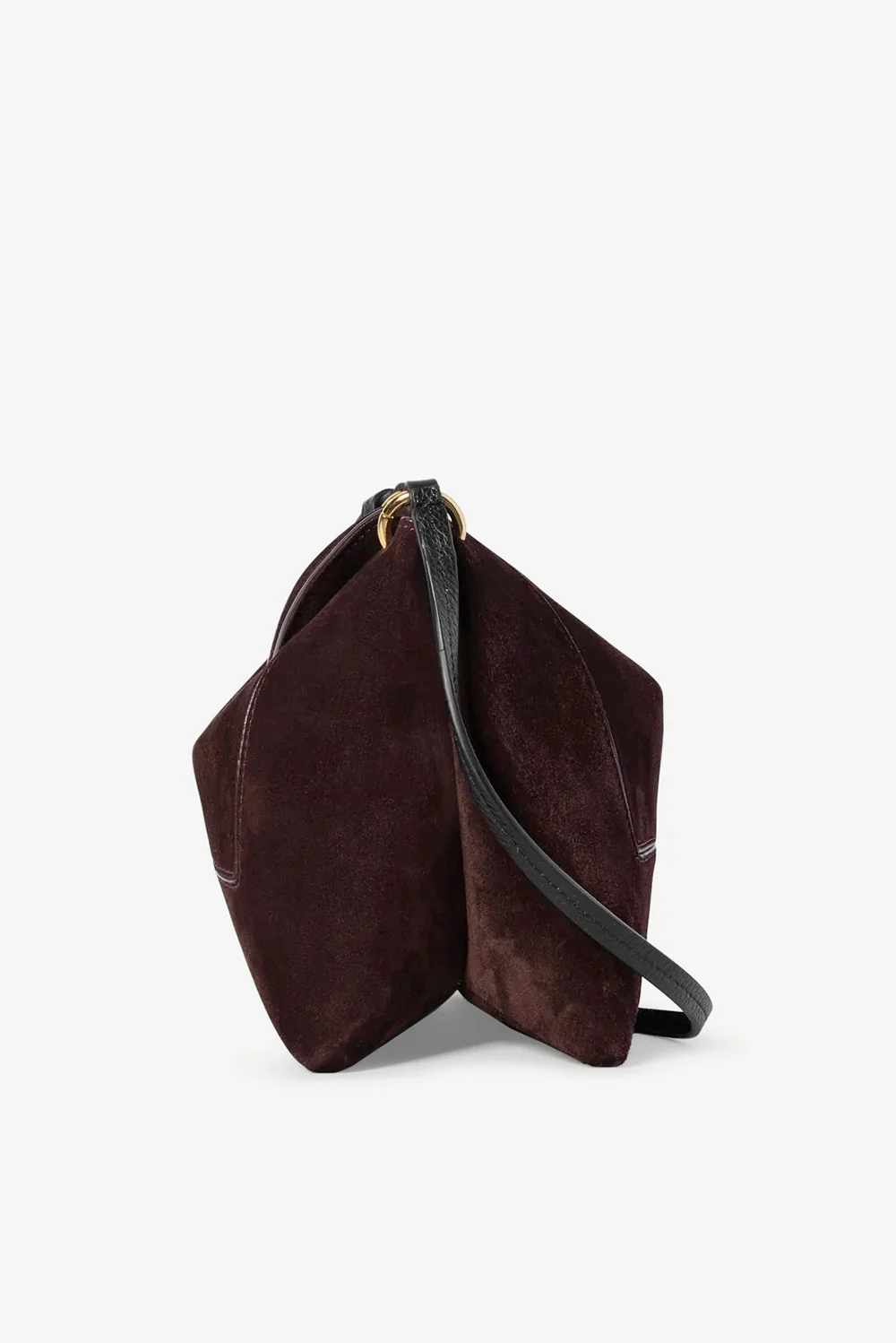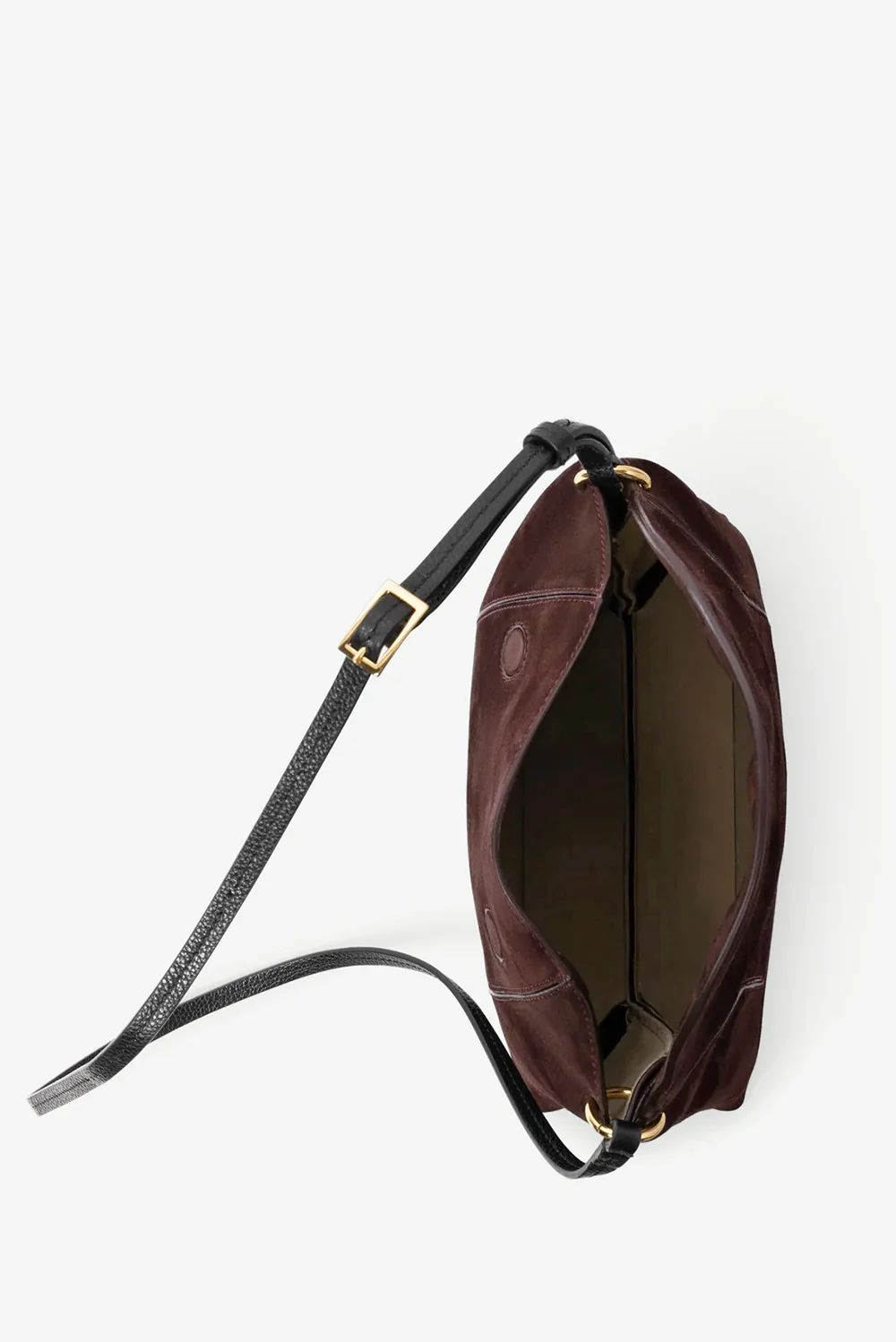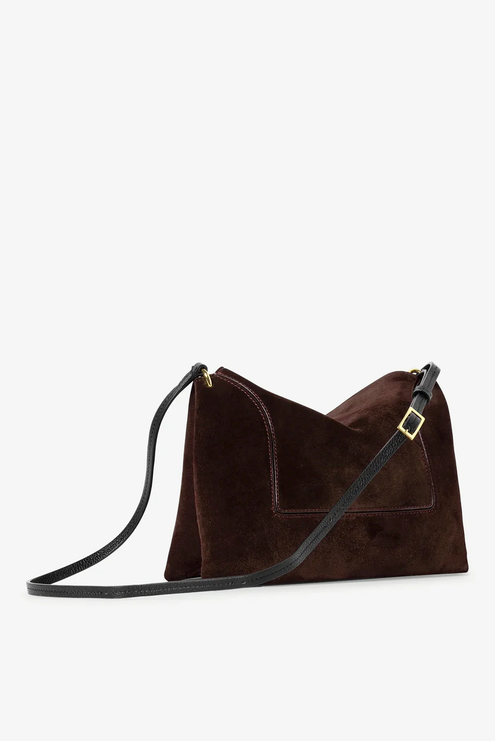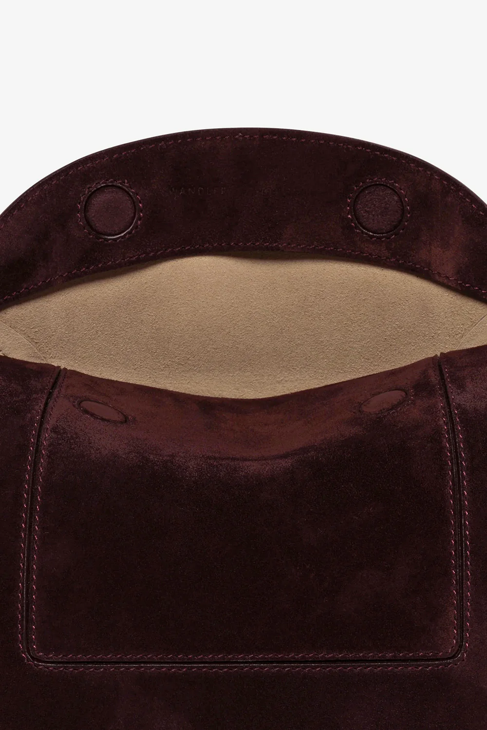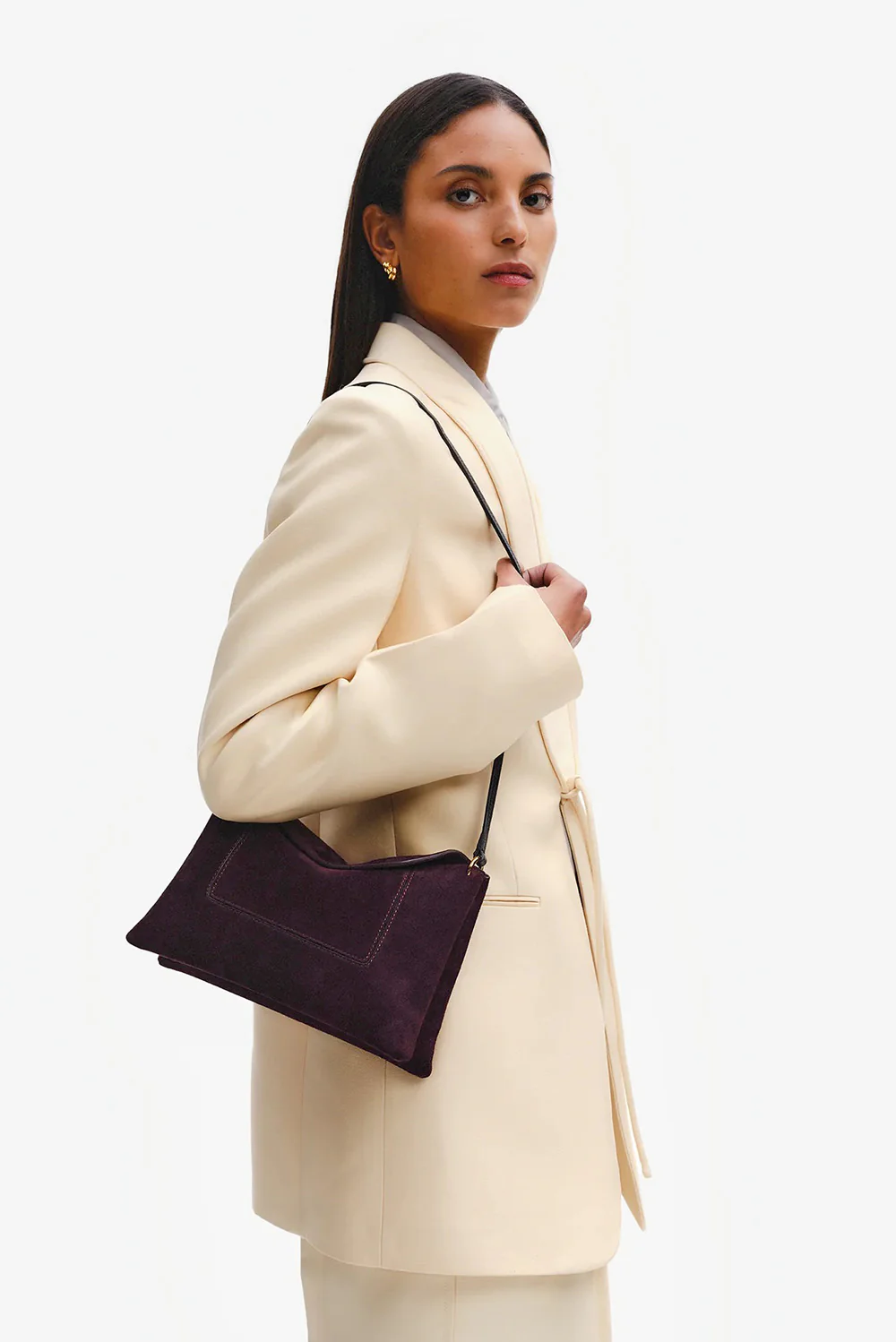 Dit is de Penelope Slouch van Wandler, een crossbody in donker acai suede met een soepel silhouet dat duidelijk opvalt door de zachte vorm. Het kalf suede voelt compact en toch buigzaam aan, waardoor de tas prettig volgt zonder zijn vorm te verliezen. De donkere basis krijgt een helder accent door de zwarte schouderriem met goudkleurige gesp, die stevig staat en fijn draagt. Voorop zie je ton sur ton stiksels die de lijnen rustig houden, met onderaan een subtiele embossing van het merk. Wandler ontwikkelt haar tassen in Italië en dat zie je terug in de nette afwerking en het zorgvuldige materiaalgebruik, passend bij dit model.