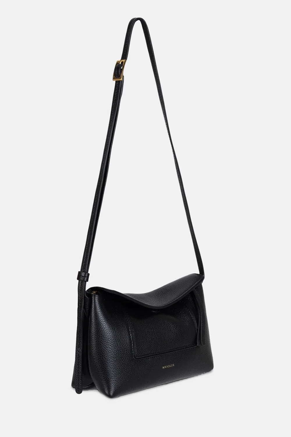 Dit is de Penelope Slouch Mini van Wandler, een kleine crossbody met een soepele vorm en een schuine flap die sierlijk sluit. Het kalfsleer voelt stevig maar toch buigzaam aan, waardoor de tas mooi aansluit langs je heup. De Black Crust kleur geeft het ontwerp een rustige diepte, met onderaan een subtiel goudkleurig logo dat strak is aangebracht. Aan de voorkant zit een ruime zak met rechte naden die direct structuur geven. De tas is in Italië met de hand gemaakt, waardoor elke rand en plooi nauwkeurig is afgewerkt. Een compact model dat licht draagt en precies genoeg ruimte biedt voor je dagelijkse essentials.