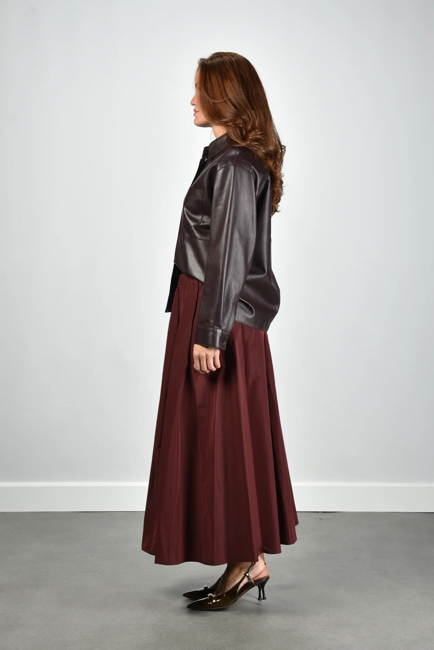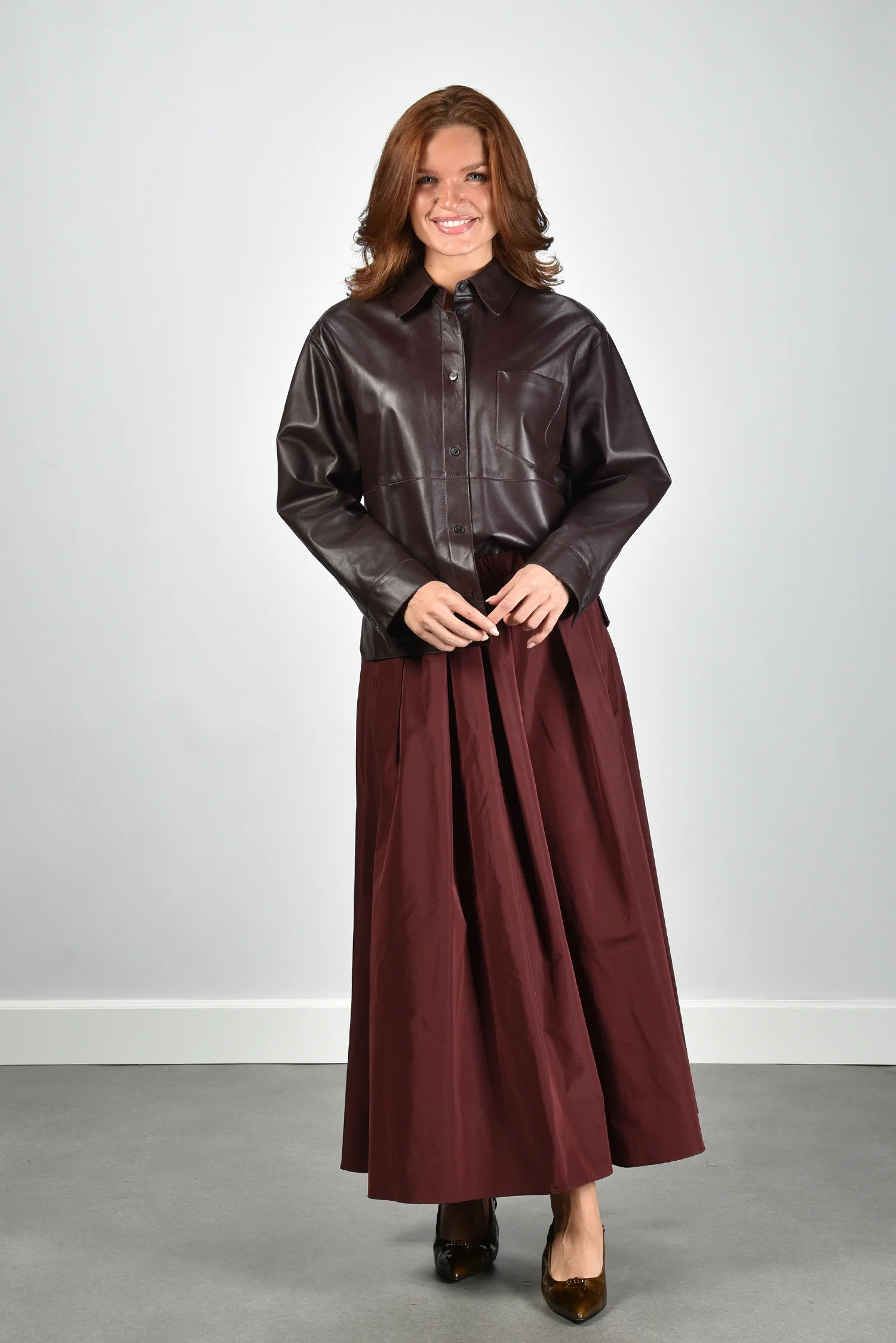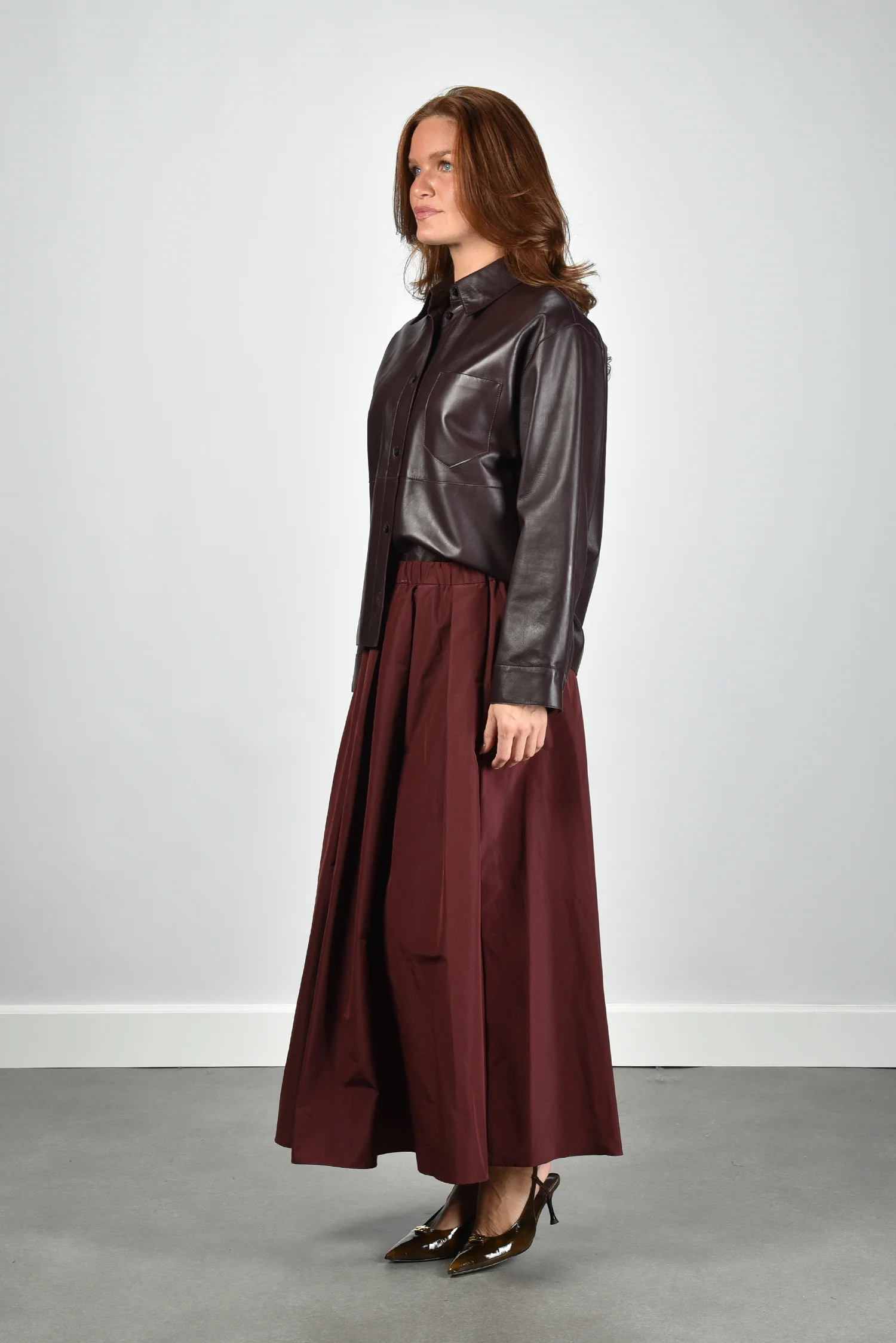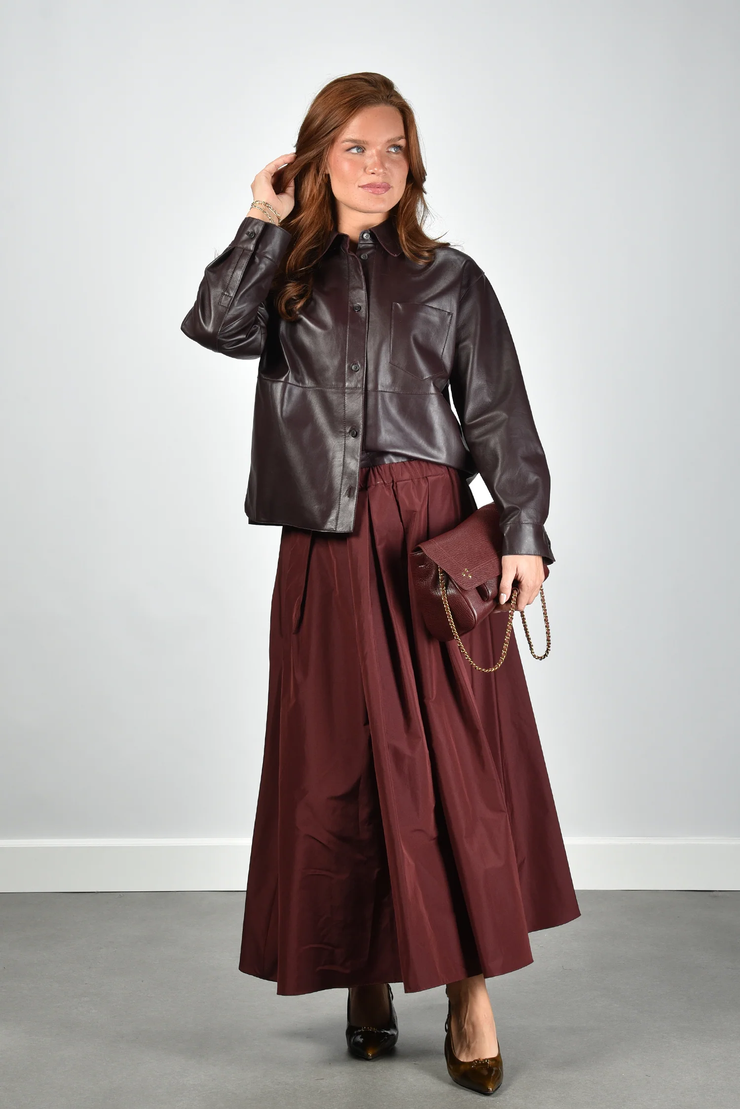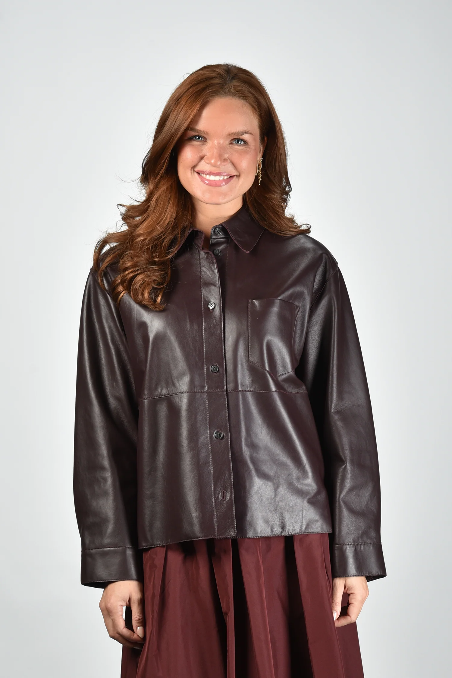 Het jack Scatola van Max Mara is uitgevoerd in soepel rood leer met een subtiel glanzende, donkerbruine toon. De rechte, iets boxy pasvorm geeft een moderne vorm die eenvoudig over een blouse of dunne knit valt. De zichtbare stiknaden en de grote borstzak links zorgen voor een sterke, maar vrouwelijke uitstraling. De knoopsluiting loopt over de volledige lengte en benadrukt de mooie structuur van het leer. Gemaakt van 100% leer, waardoor het jack stevig aanvoelt en fraai in model blijft. Combineer dit jack met de Weekend Max Mara rok Curvato 007 bordeaux voor een stijlvolle ton sur ton set. Dit ontwerp laat goed zien waarom Max Mara zo geliefd is om zijn vakmanschap en gevoel voor vorm.