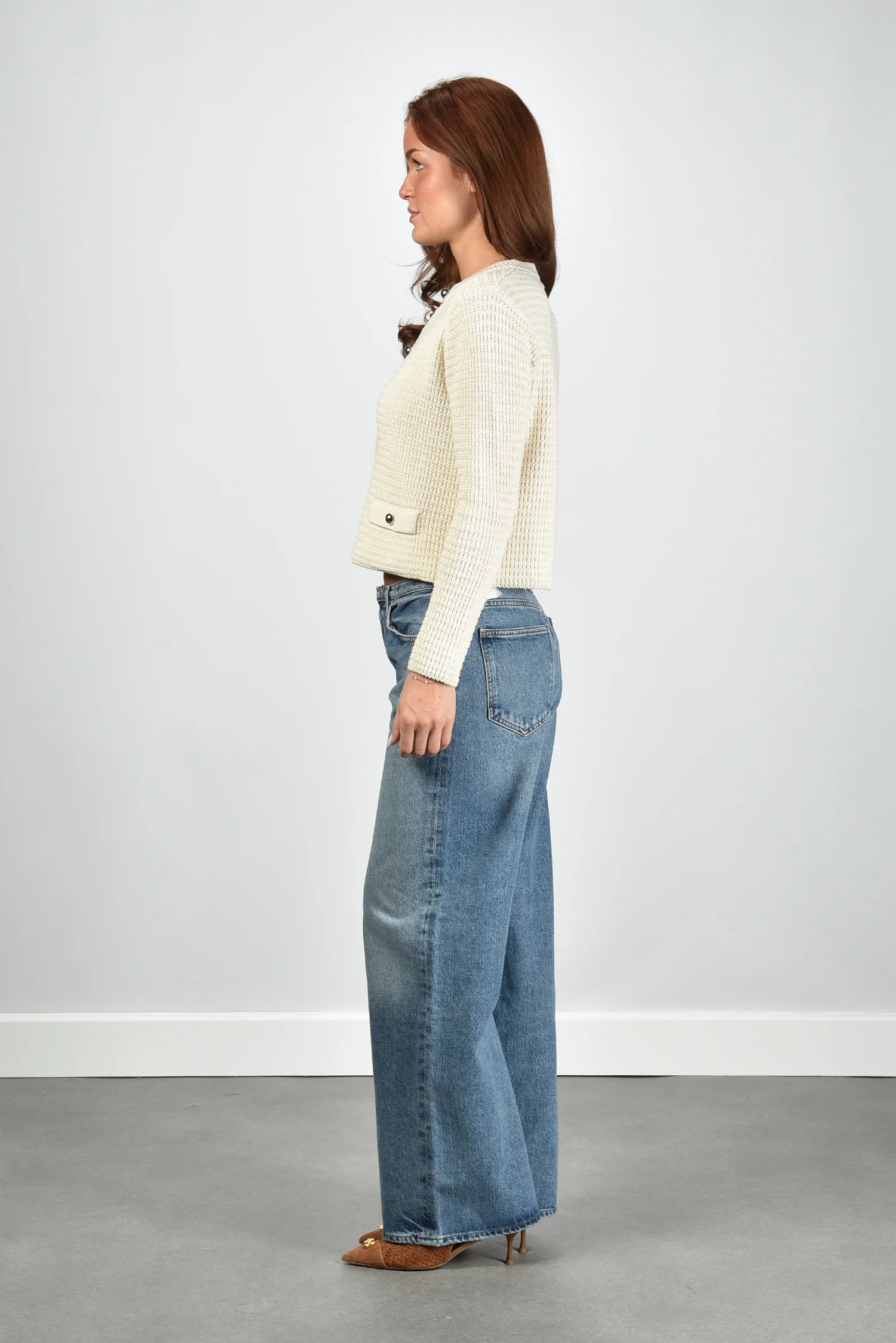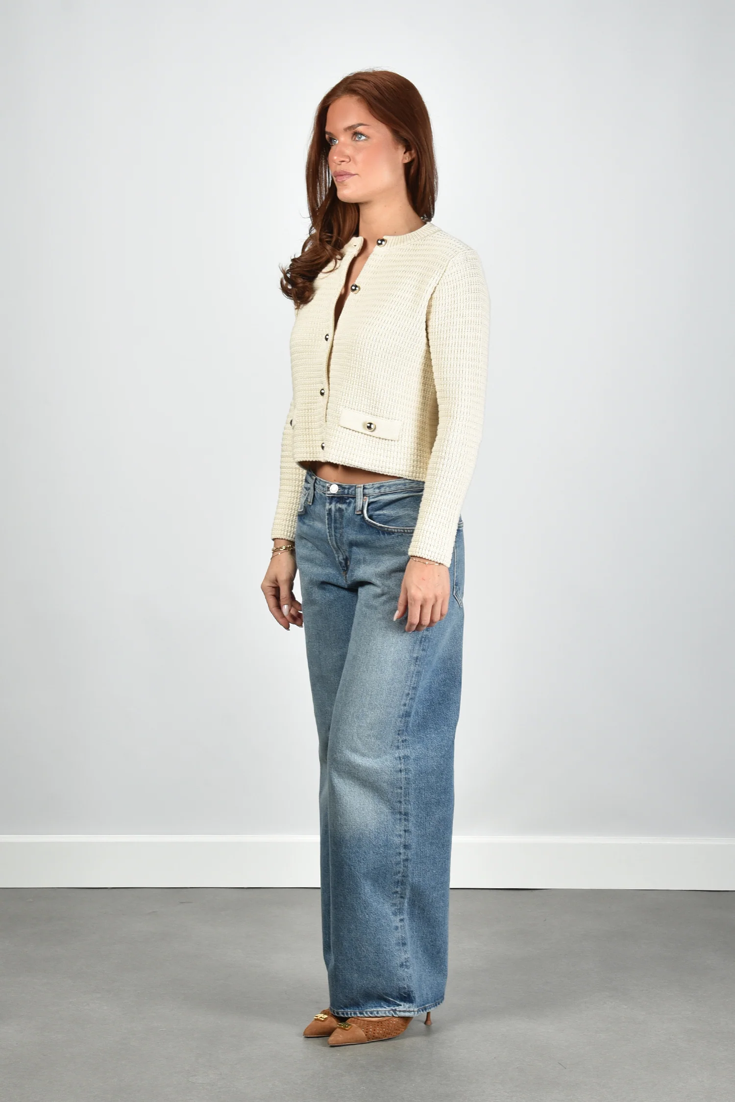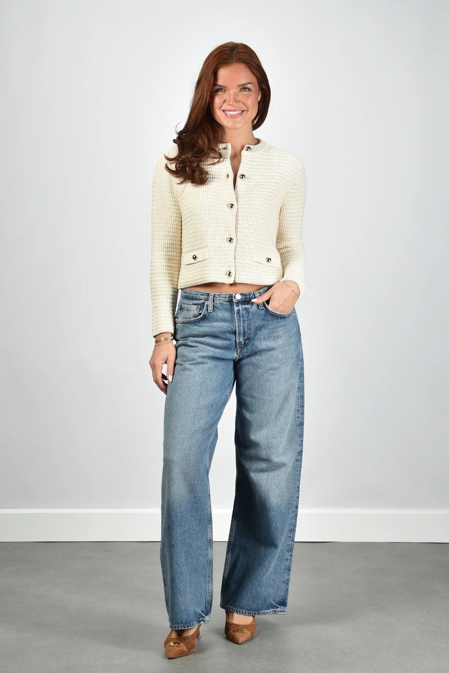 Het vest Vodka in crème van Weekend Max Mara heeft een balans tussen structuur en zachtheid. De wafelachtige textuur geeft het compacte breisel een mooi reliëf dat direct opvalt. De grote knopen aan de voorkant zorgen voor een duidelijke, stijlvolle lijn en maken het vest makkelijk te sluiten of open te dragen. De korte lengte geeft een frisse, moderne vorm, terwijl de ronde hals het geheel netjes afmaakt. De twee sierzakken met knoopdetails voegen subtiel karakter toe. Dankzij het katoen met een vleugje polyester blijft het vest vormvast en prettig stevig aanvoelen. Draag het met een jeans of onder de Weekend Max Mara jas Smalto in hazelnut voor een complete set.