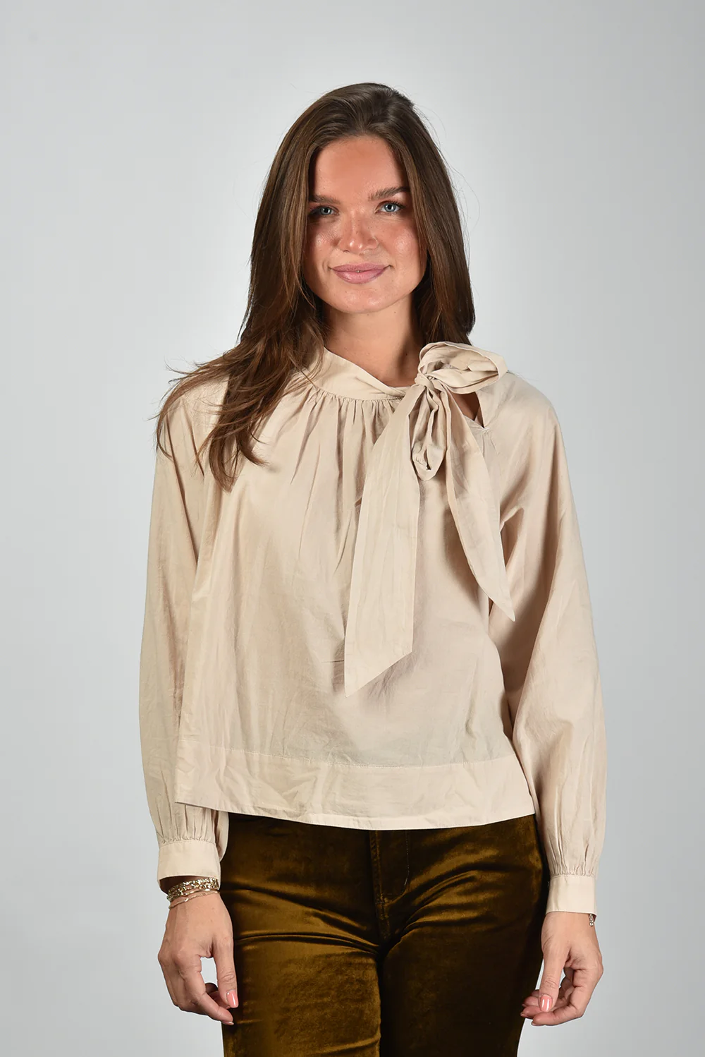 De blouse Leona van Xirena is zo’n item dat meteen opvalt door zijn nonchalante ontwerp en subtiele details. De grote strik op de schouder geeft het model iets speels, terwijl de gerimpelde stof rond de halslijn zorgt voor een losvallend silhouet. De wijde mouwen lopen smal toe aan de pols, wat het geheel een verzorgde vorm geeft. De blouse is gemaakt van 100% katoen, licht en zacht op de huid. De beige tint, die Xirena zelf parchment noemt, laat zich gemakkelijk stylen met denim of lichte tinten. Probeer haar eens met de Citizens of Humanity broek Kimberly 70s Flare voor een ontspannen, moderne combinatie. De pasvorm valt normaal, dus je kunt gerust je gebruikelijke maat kiezen. Xirena uit Californië staat bekend om zijn ontspannen silhouetten en materialen, die het dagelijks dragen bijzonder maken zonder dat het eraan af te zien is.