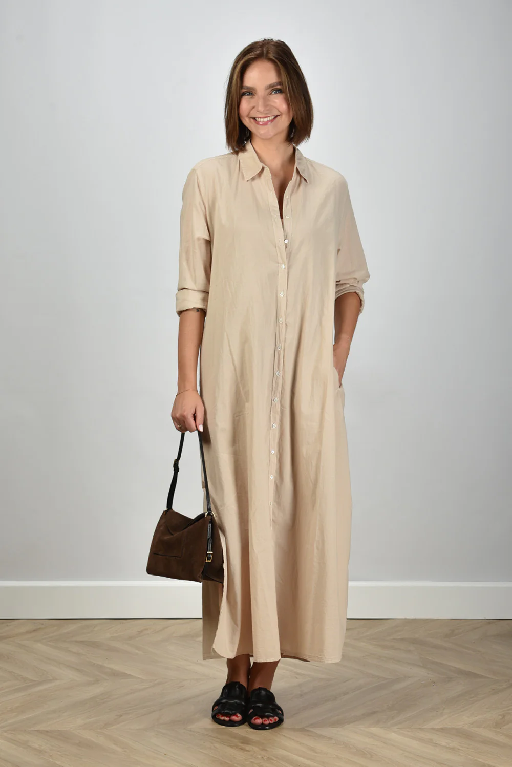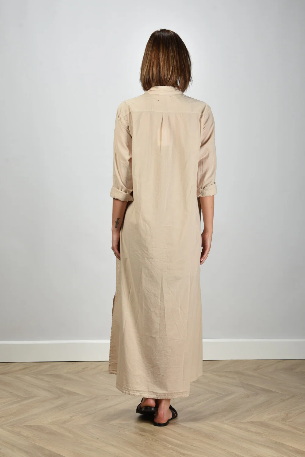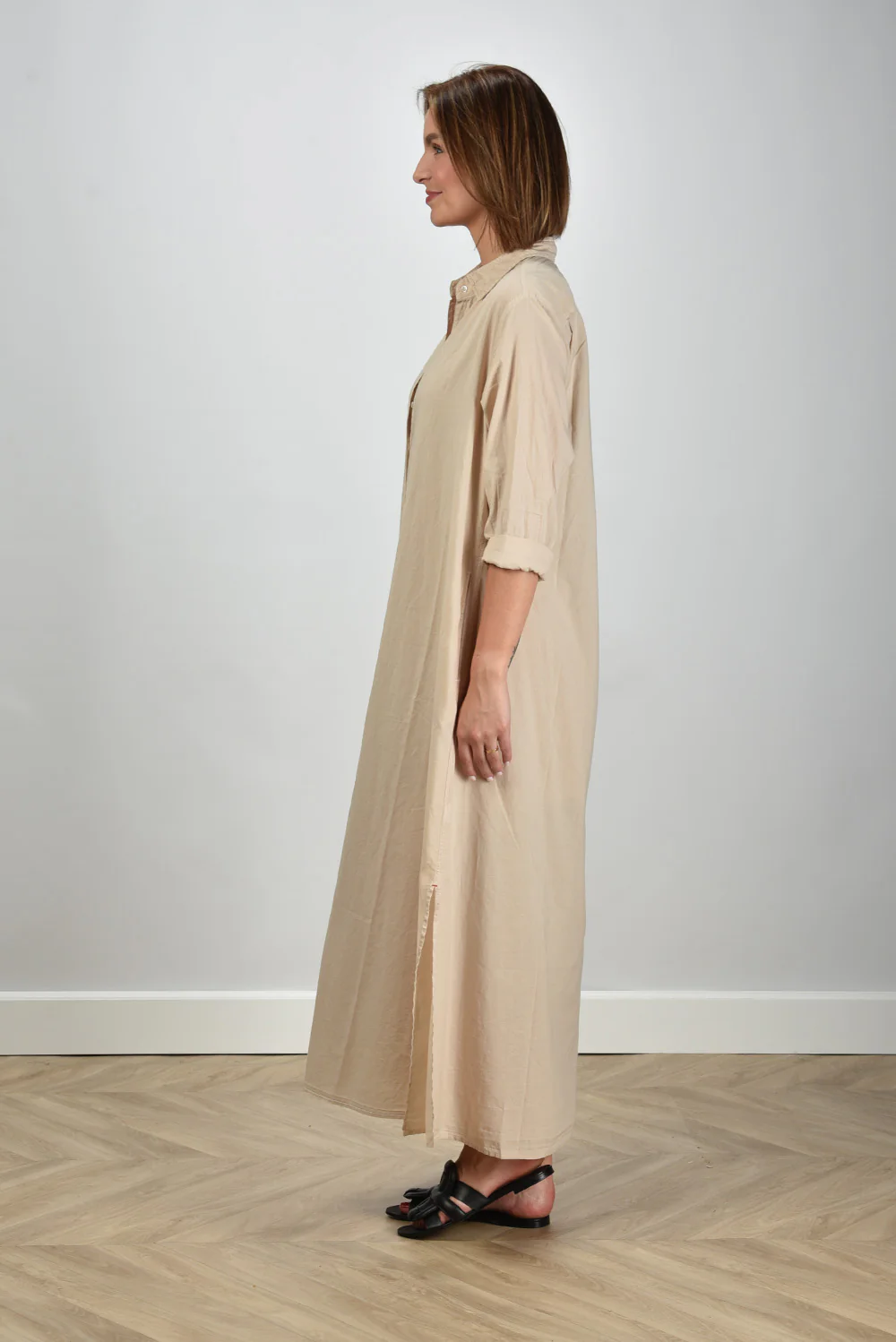 De jurk Boden van Xirena is zo’n item dat direct aandacht trekt door zijn rustige eenvoud. Gemaakt van 100% katoen voelt de stof luchtig en zacht aan, prettig om te dragen op warme dagen. De kleur beige, ook wel parchment genoemd, geeft de jurk die typische natuurlijke tint waar Xirena om bekendstaat. De lange knoopsluiting langs het voorpand zorgt voor een ontspannen silhouet dat je naar wens open of dicht draagt. De opgerolde mouwen tot net onder de elleboog geven een nonchalante touch. Handig detail: de steekzakken in de zijnaad. De jurk valt normaal op maat en combineert mooi met de Morobe sandalen Robien 02 black, voor een stijlvolle en soepele look die past bij het luchtige karakter van het merk.