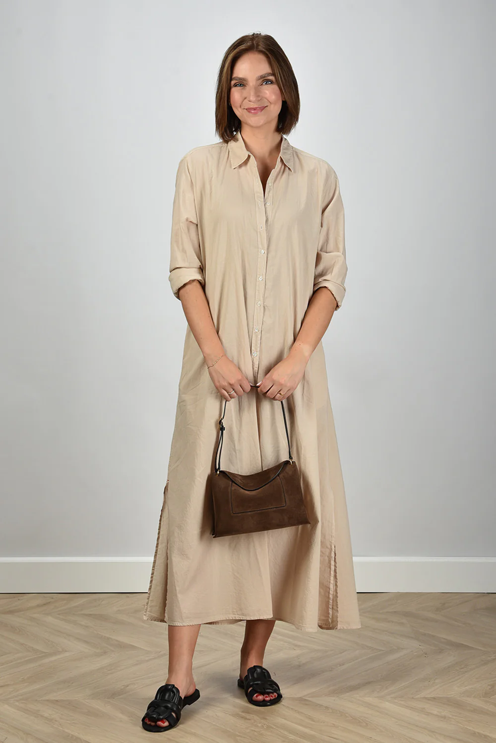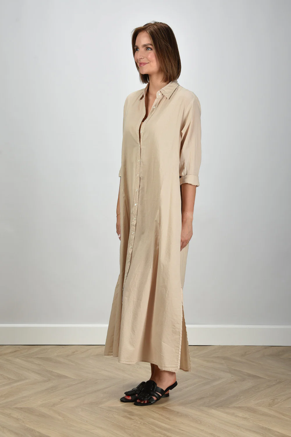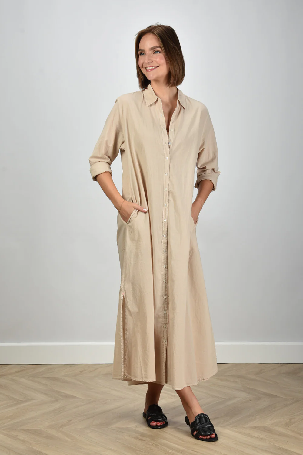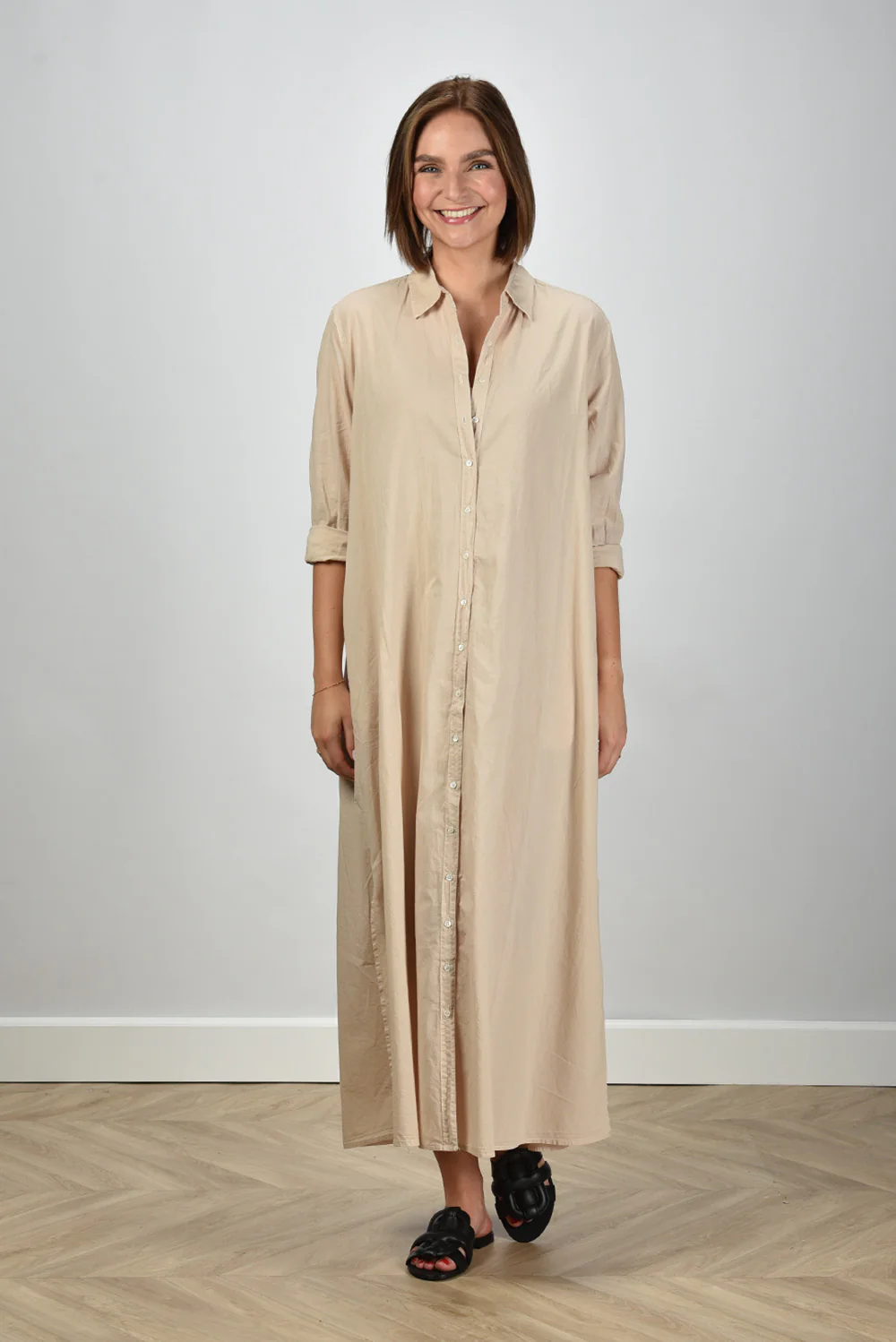 De jurk Boden van Xirena is zo’n item dat direct aandacht trekt door zijn rustige eenvoud. Gemaakt van 100% katoen voelt de stof luchtig en zacht aan, prettig om te dragen op warme dagen. De kleur beige, ook wel parchment genoemd, geeft de jurk die typische natuurlijke tint waar Xirena om bekendstaat. De lange knoopsluiting langs het voorpand zorgt voor een ontspannen silhouet dat je naar wens open of dicht draagt. De opgerolde mouwen tot net onder de elleboog geven een nonchalante touch. Handig detail: de steekzakken in de zijnaad. De jurk valt normaal op maat en combineert mooi met de Morobe sandalen Robien 02 black, voor een stijlvolle en soepele look die past bij het luchtige karakter van het merk.
