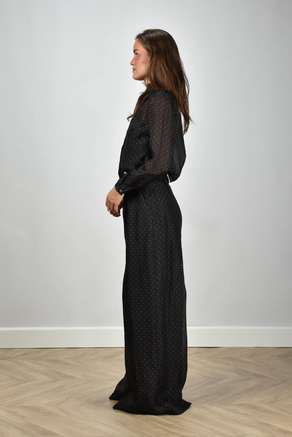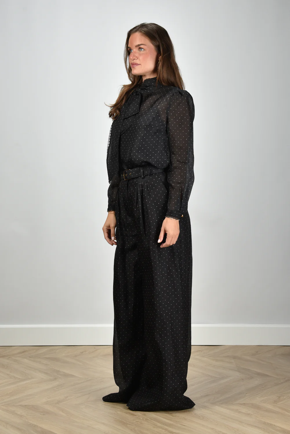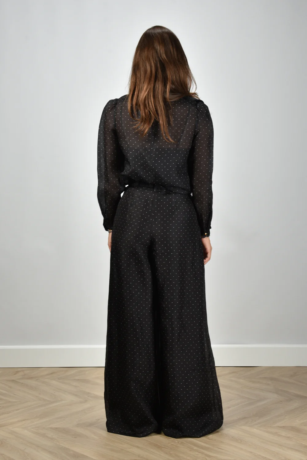 De blouse Dream Pussybow van Zimmermann is een elegante blouse met witte dots op zwarte zijde‑linnenstof. De lichte glans van de mix voelt zacht en luchtig, met een subtiele structuur die mooi valt. Opvallend is de grote strik bij de hals, die speels over het borstpand ligt. De transparante mouwen met lichte pof bij de schouders geven de blouse een sierlijke vorm. De Dream Pussybow valt normaal op maat en draagt soepel. Combineer dit ontwerp met de Zimmermann broek Dream Wide Leg in dezelfde black dot print voor een complete, stijlvolle set.