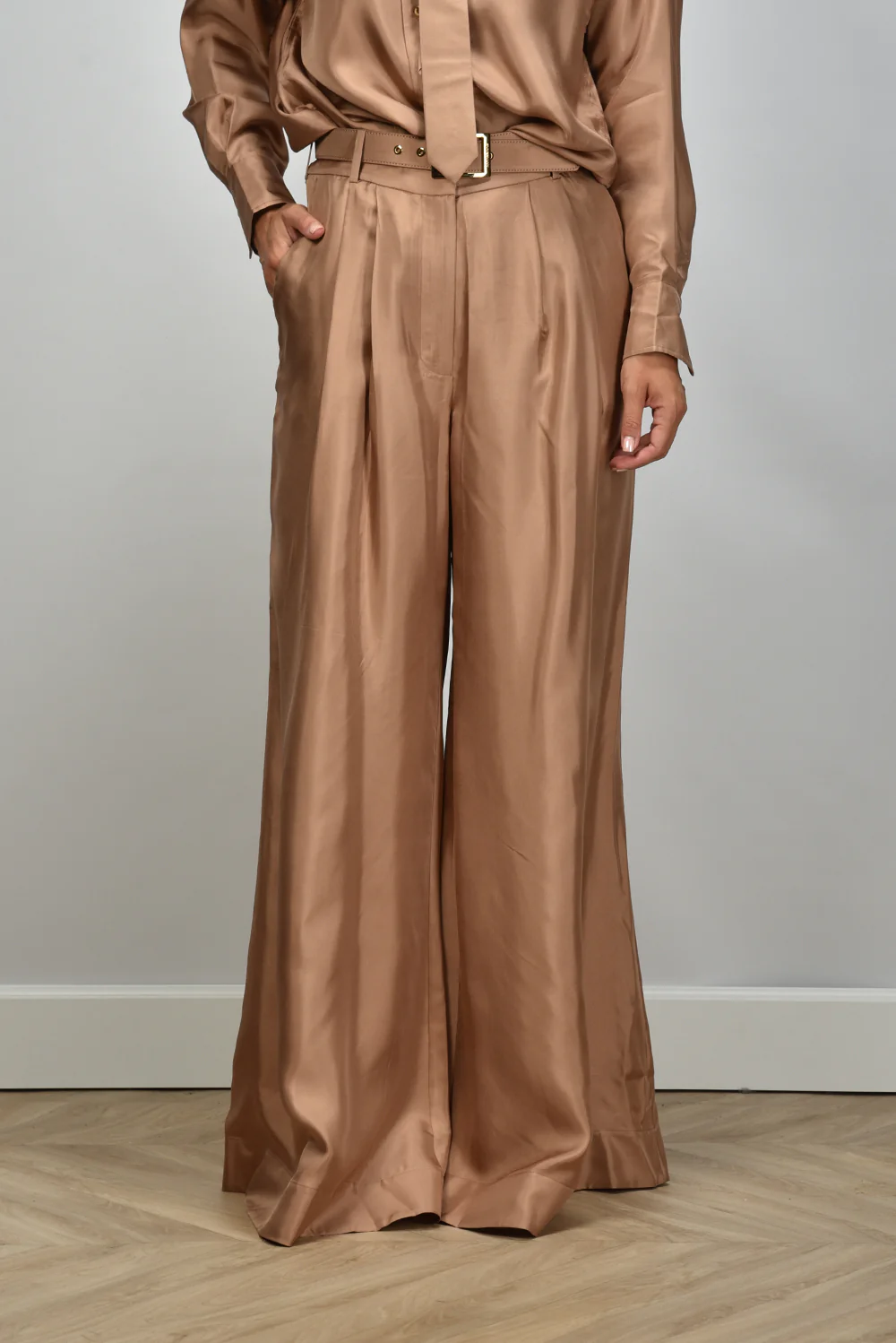 De broek Wide Leg beige van Zimmermann trekt direct de aandacht door haar luxueuze zijde en royale snit. De wijd uitlopende pijpen vallen soepel en lang, met diepe plooien die structuur geven zonder stijf te ogen. De hoge taille met brede ceintuur en opvallende gesp benadrukt het silhouet op een subtiele, stijlvolle manier. De kleur biscuit geeft de zijde een zachte glans waardoor de stof mooi in het licht speelt. Combineer de broek met de Morobe sandalen Abbie 03 bronze specchio voor een elegante, zomerse set met een harmonieuze uitstraling.