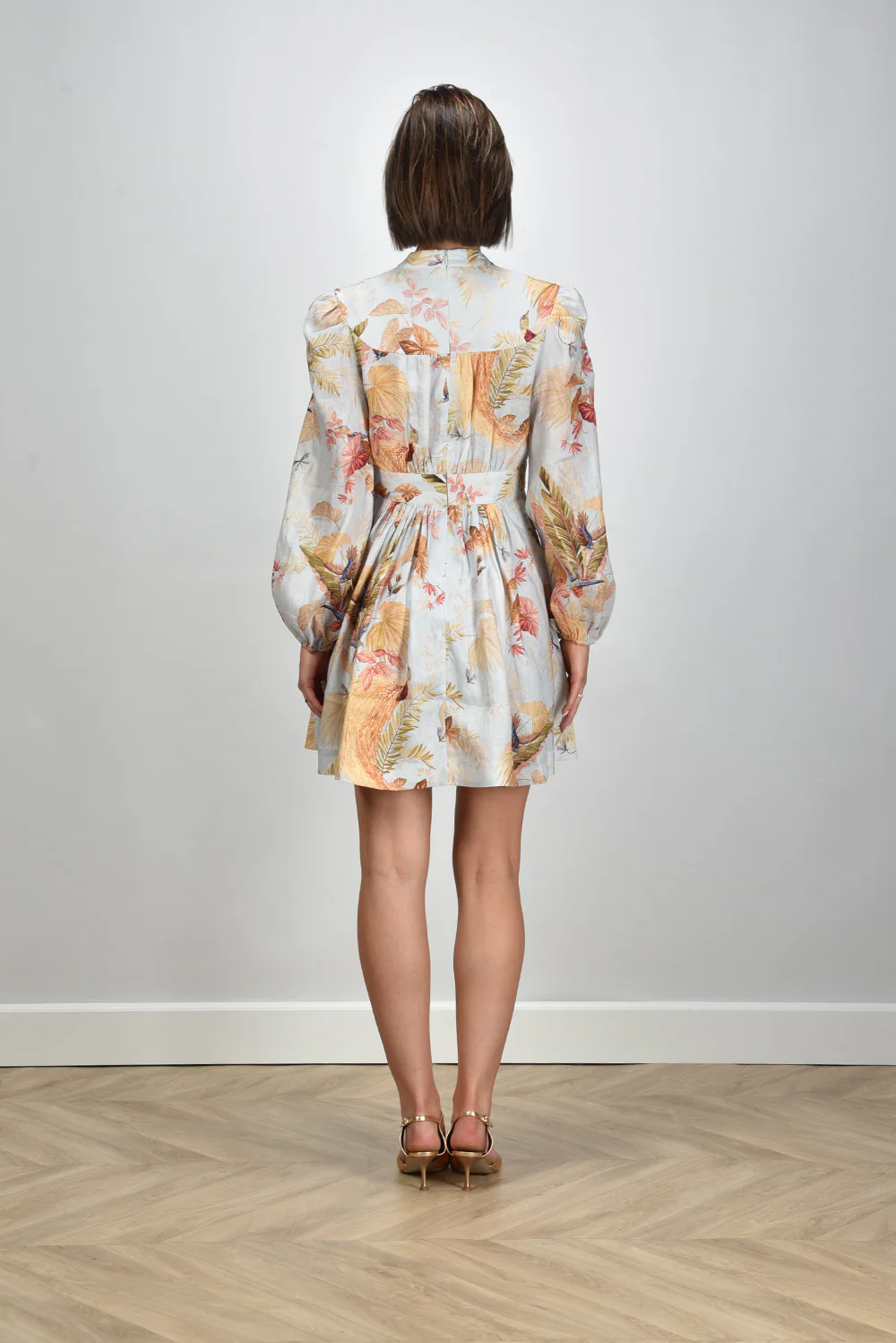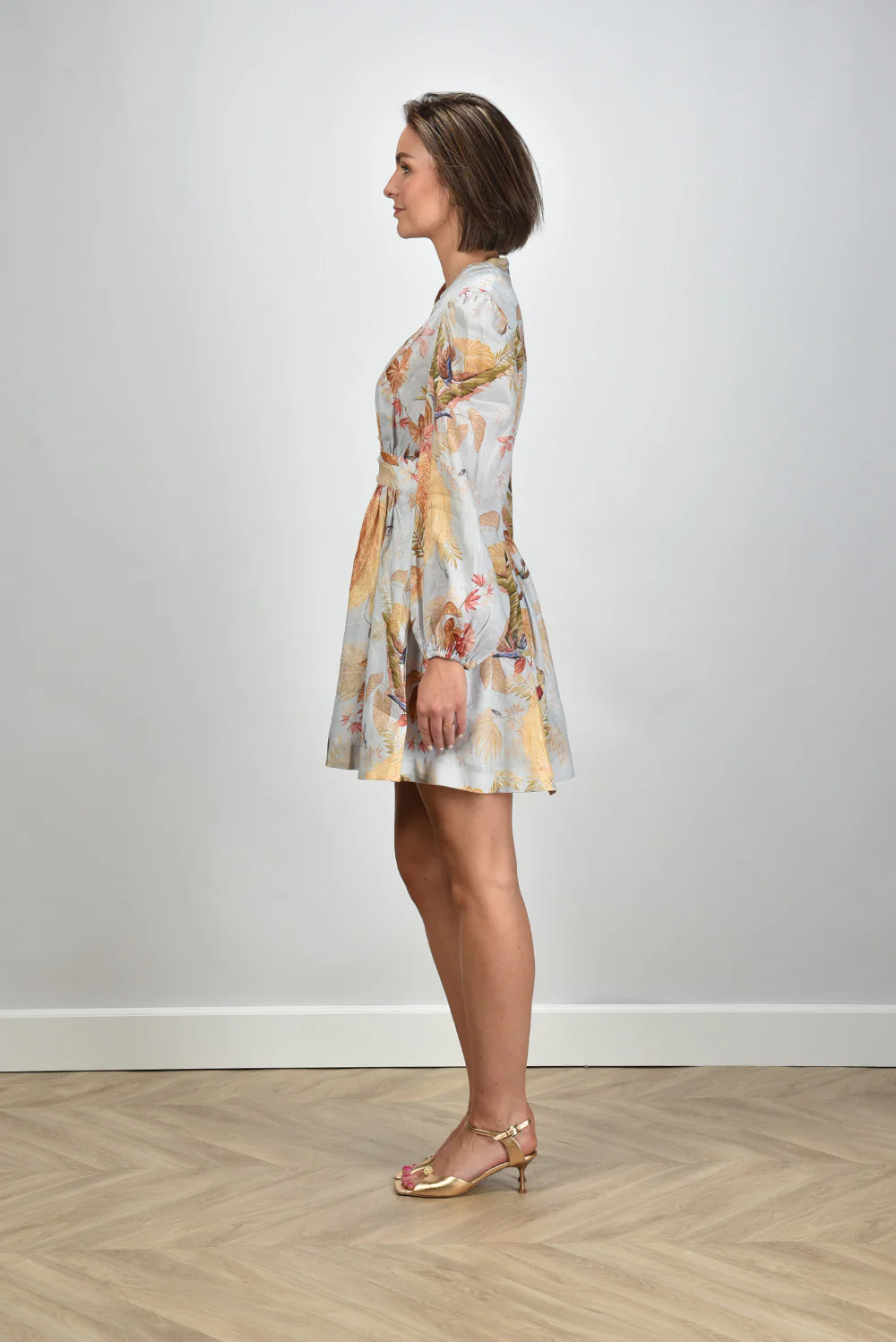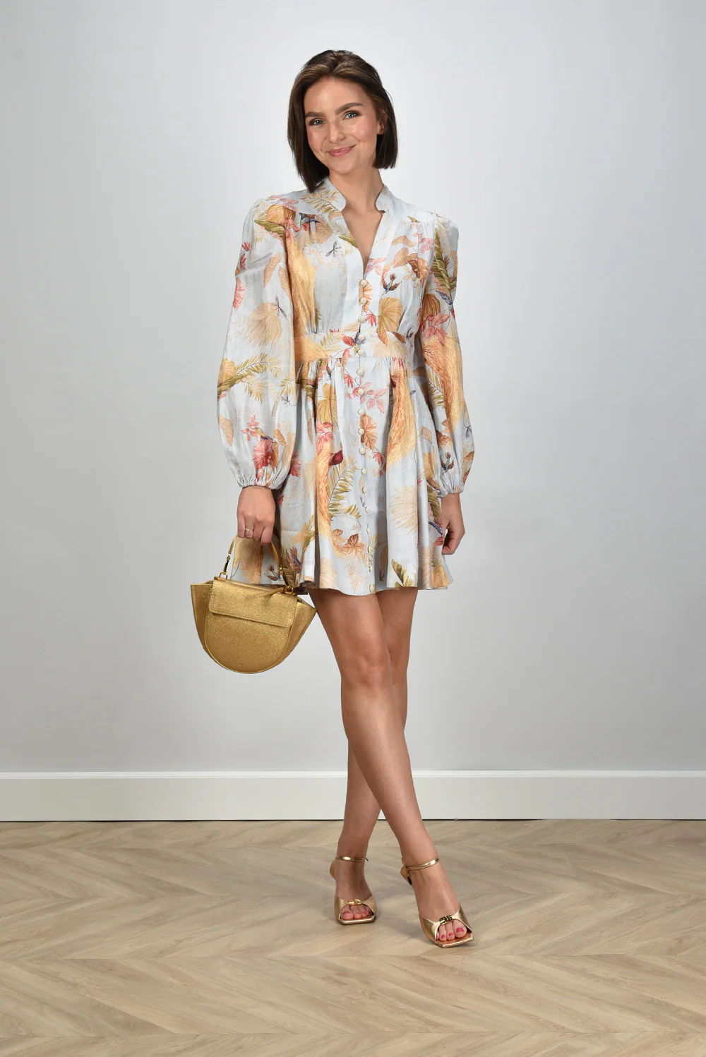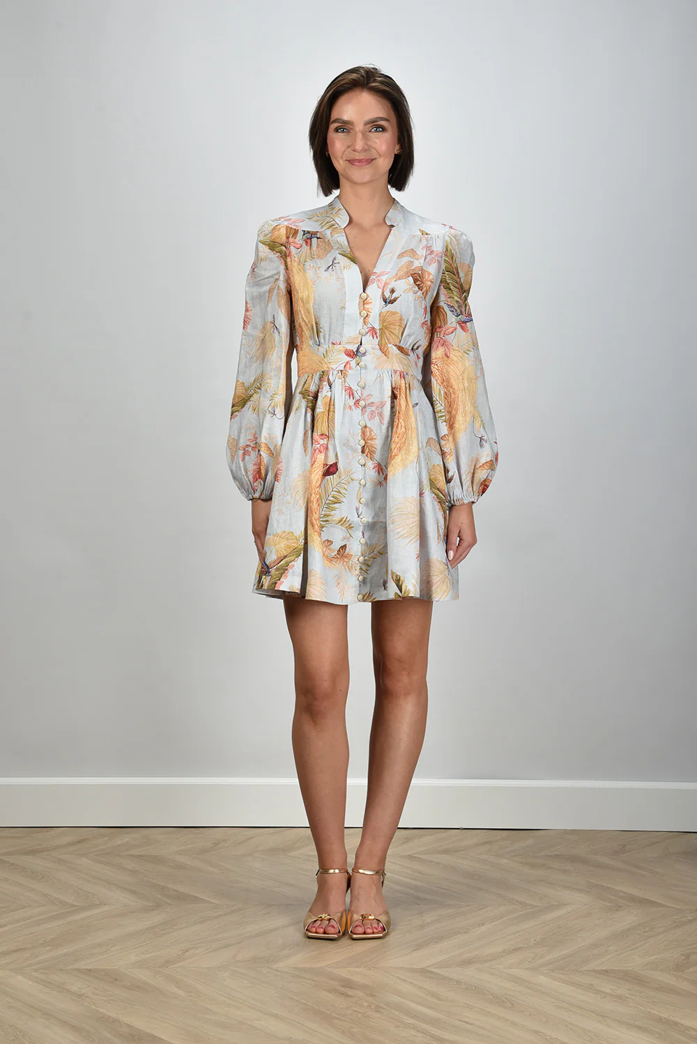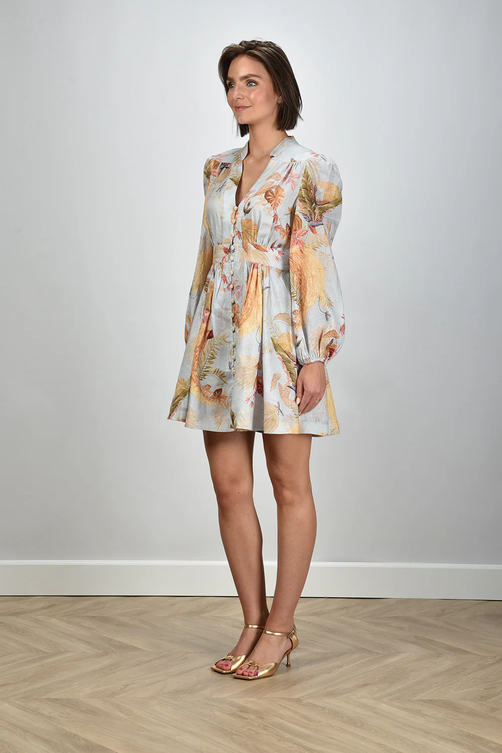 De jurk Ascension Plunge van Zimmermann trekt aandacht door de kleurrijke bloemenprint in light blue palm floral. De soepele linnen stof voelt luchtig aan en geeft de korte, uitlopende rok een natuurlijke zwier. Het model heeft lange, wijde mouwen met een elastische boord, wat mooi aansluit bij de diepe V-hals en de knoopsluiting vooraan. De taille is subtiel geaccentueerd, waardoor het silhouet vrouwelijk en in balans oogt. Draag de jurk met de Morobe sandalen Mimi 36 nude voor een lichte, zomerse combinatie die elegant blijft in elke setting.