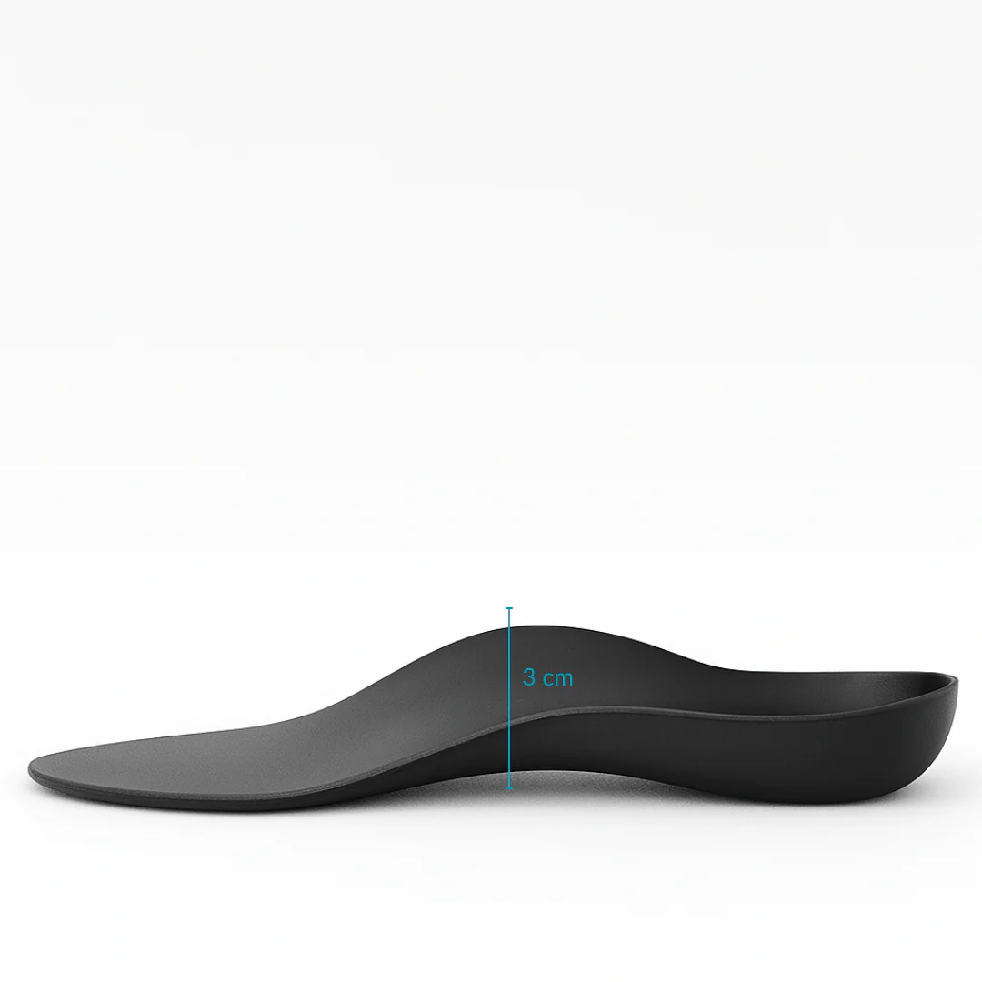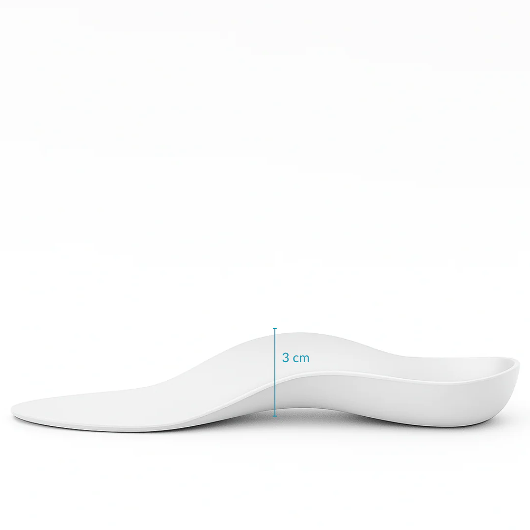 Deze inlegzolen zijn ontworpen voor doorgezakte voeten en bieden stevige voetboogondersteuning met een 3 cm hoge boog en een diepe hielcup voor betere stabiliteit en drukverdeling.